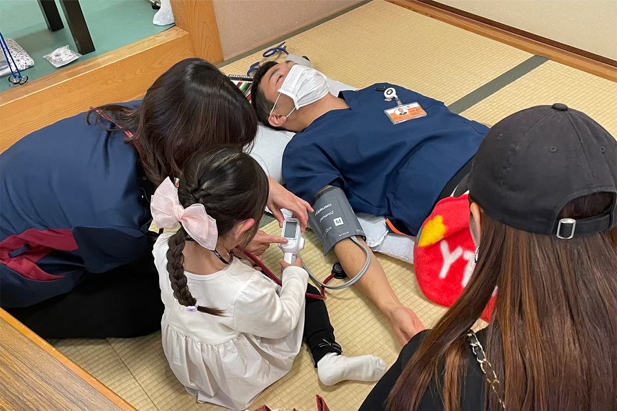 血圧測定や、聴診器を用いて健康観察業務の体験になります。